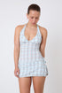 The Cindy Halter Skort Dress is a fitted mini dress with sewn in shorts for coverage, crafted from recycled gingham seersucker. It features a plunge neckline, open back, and tie up halter neck. Features a side tie at the skirt and soft stretch fabric that sculpts the body.