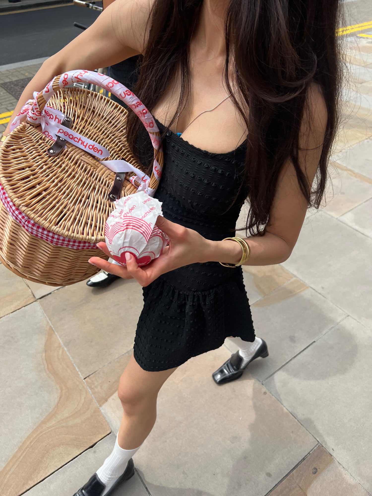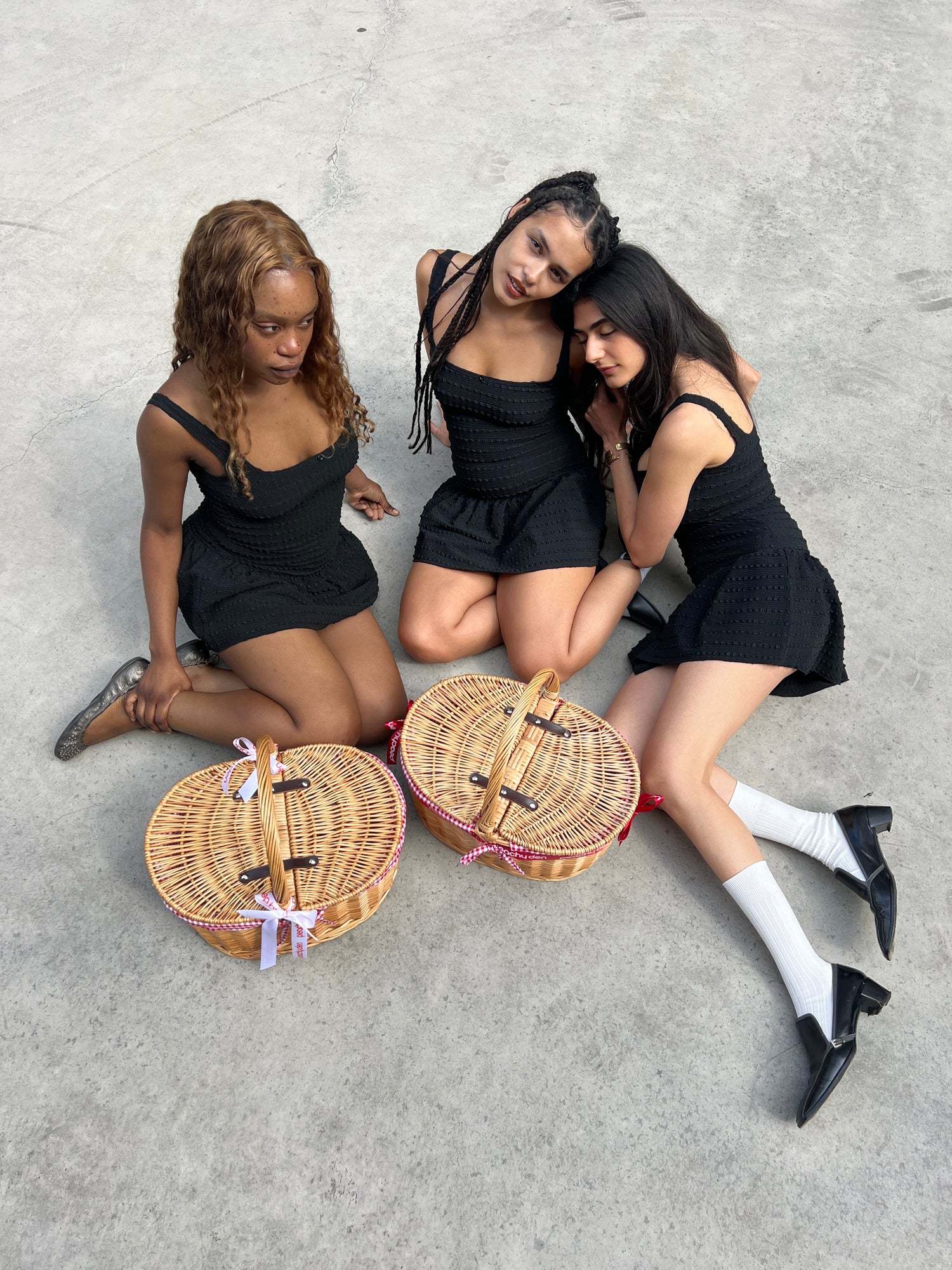 In their matching Cindy Frill Dresses, the girls set out from the Peachy Den Store armed with wicker baskets overflowing with ripe, juicy peaches, ready to share with anyone in need of a little sweetness. Our peaches were lovingly wrapped, making them the perfect treat for a summer day.