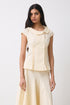 Fitted cap sleeve blouse with an asymmetric curved wide collar.