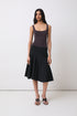 Low rise midi skirt with subtle volume and flattering A-line silhouette.