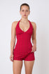 The Cindy Halter Skort Dress is a fitted mini dress with sewn in shorts for coverage, crafted from recycled gingham seersucker. It features a plunge neckline, open back, and tie up halter neck. Features a side tie at the skirt and soft stretch fabric that sculpts the body.