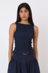 The Deba Top in Midnight is a sleeveless, boatneck top with a shirred bodice and peplum hem, combining a feminine style with a techy touch. Made from signature core nylon, it pairs perfectly with The Deba Midi Skirt Pockets in Midnight.