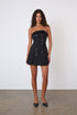 A strapless mini dress, fitted through the bust and waist, kicking out into an A-line silhouette.