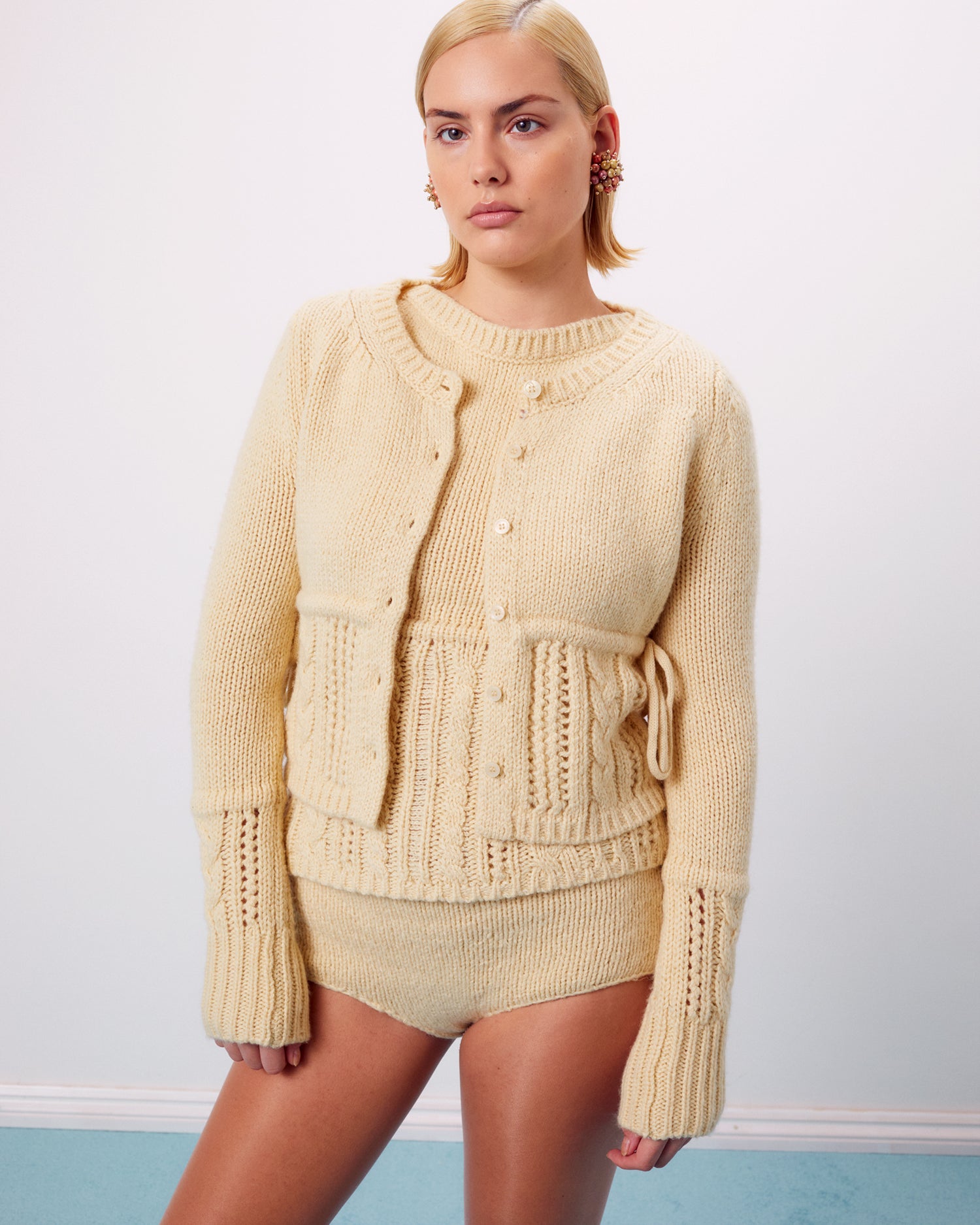 Elsa was not as well known as her great rival, Gabrielle “Coco” Chanel, who became famous for popularising sporty, casual chic as the feminine style. She pioneered the use of knitted jersey in high fashion, famed for her twin sets and matching tweed suits. Our chunky knit twin set “Gabrielle” carries her legacy of youthful, feminine ease.