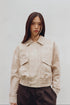 Flight jacket inspired bomber with a classic collar, deep waistband and wide front placket featuring a hidden zip and metal popper closures.